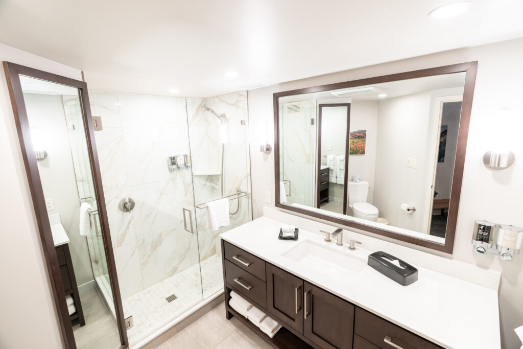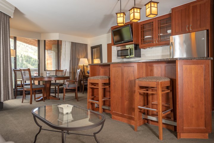 A Pinnacle condominium consists of 2 bedrooms and a kitchen room providing 1,682 Sq. Ft. of living space with accommodations for up to 10 people. Each bedroom provides a king size bed, as well as a queen size sofa bed. The kitchen room also has a queen size sofa sleeper. The kitchen consists of a refrigerator, microwave, dishwasher, stove, oven and coffee maker. Additionally, there is a partial kitchen with a microwave and small refrigerator in each bedroom. Each bedroom has a 55” TV with an in-wall HDMI port for easy access. The living / kitchen area has a 32” television with DVD player. All three rooms have balconies, one with a hot tub which is part of the kitchen room.